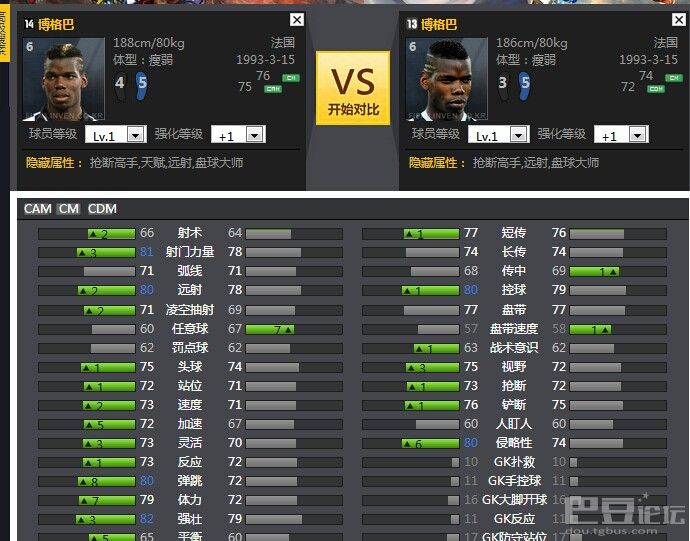 博格巴拥有不错的远射能力、不差的速度、相对强壮的身体以及相对出色的盘带能力绝对令他在高级CM中占据一席之地,不过其组织能力稍差、体力更是令人担忧,但是14卡的他各项数据大涨,让弥补他缺点,增加天赋隐蔽属性,让他可以在禁区随意ZD,防守属性加强,也可以让他客串后腰,然而他缺点就是位置感不好,有时候老丢人.